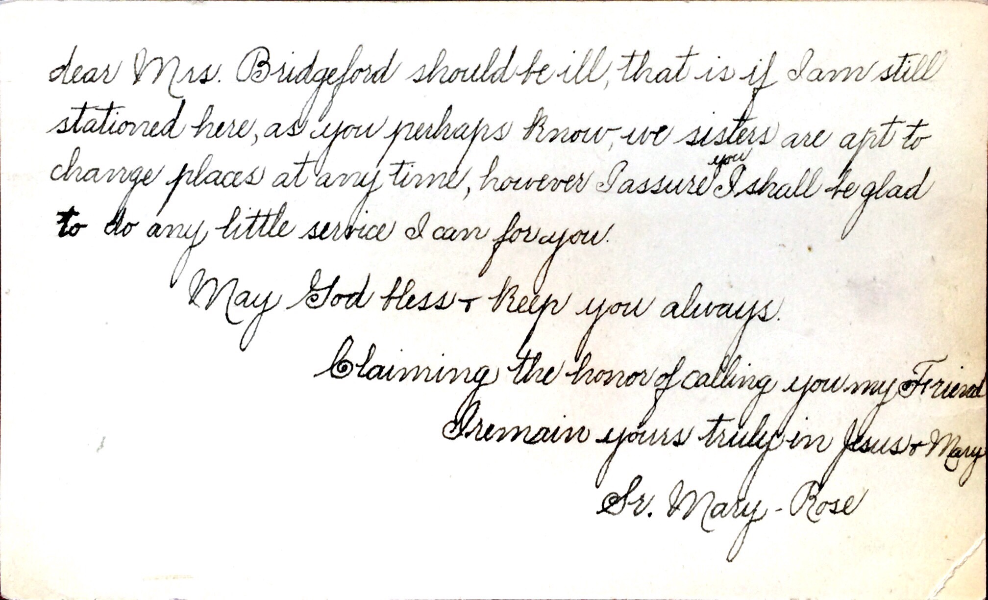 I will consider it a duty for me to let you know if at any time dear Mrs. Bridgeford should be ill, that is if I am still stationed here, as you perhaps know, we sisters are apt to change places at any time, however I assure you I shall be glad to do any little service I can for you.