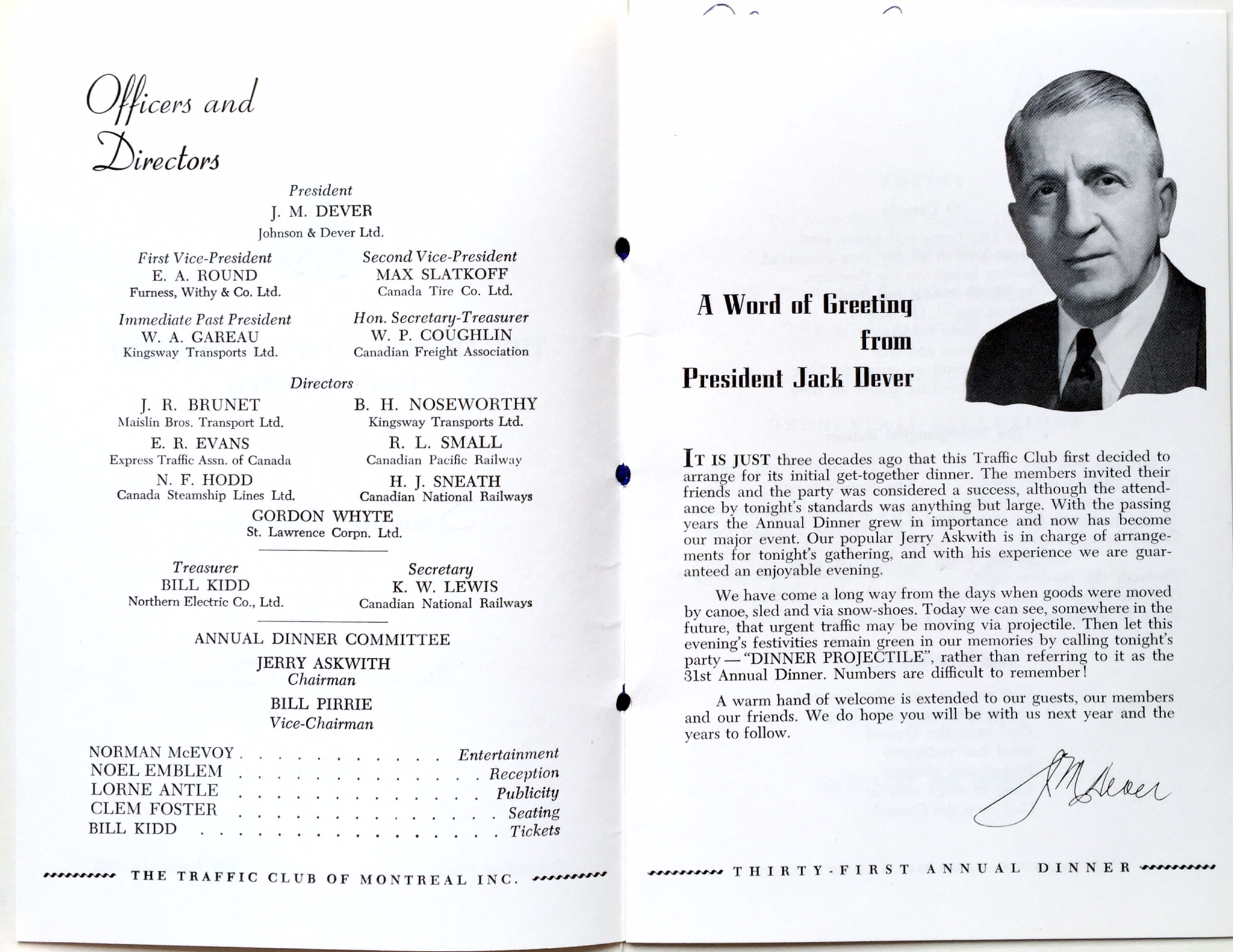 Jack was well known for his sense of humour and was the host for many occassions, including the banquet for the Montreal Traffic Club in 1960.